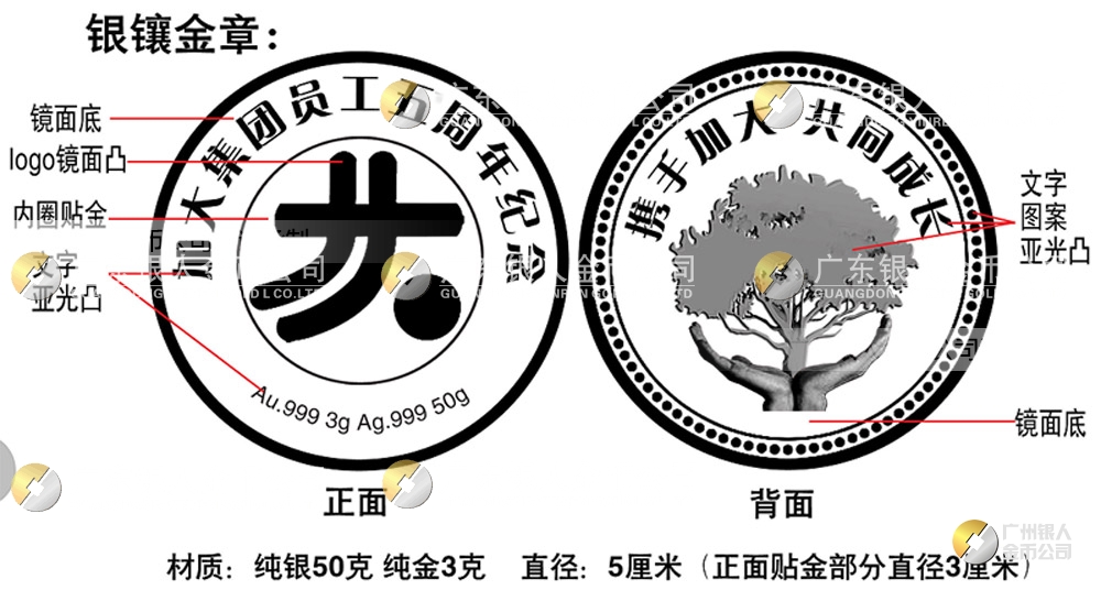 廣東銀人金幣/紀念幣制造廠家——是經中國人民銀行批準,持有央行《經營流通人民幣許可證》,由國家政府單位認可批準、具備資質、合法銷售定制金銀幣、紀念幣的金幣公司, 一直致力于金銀幣、紀念幣、獎章、獎牌、徽章、紀念章的設計制作、模具開發、生產定制。