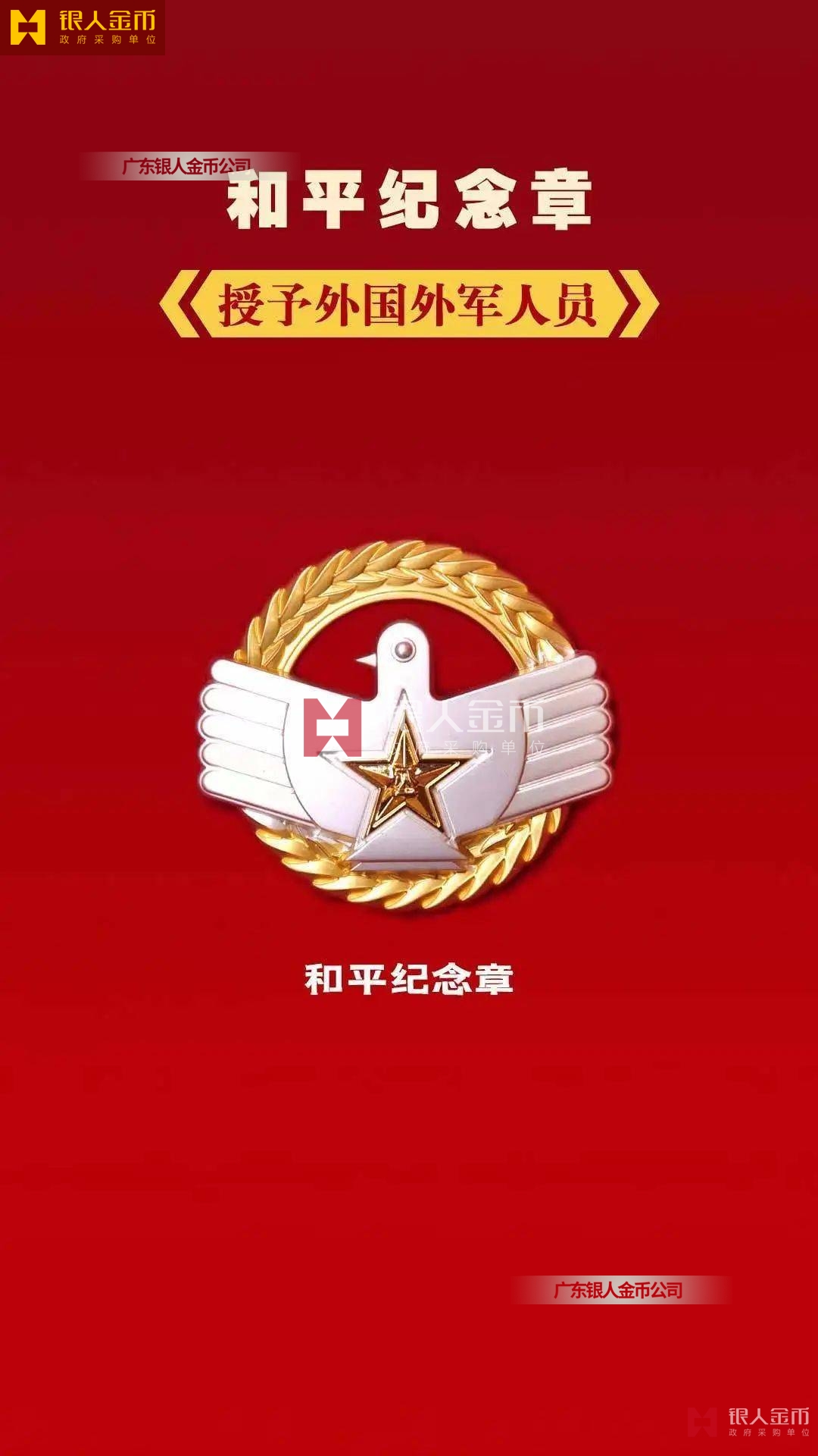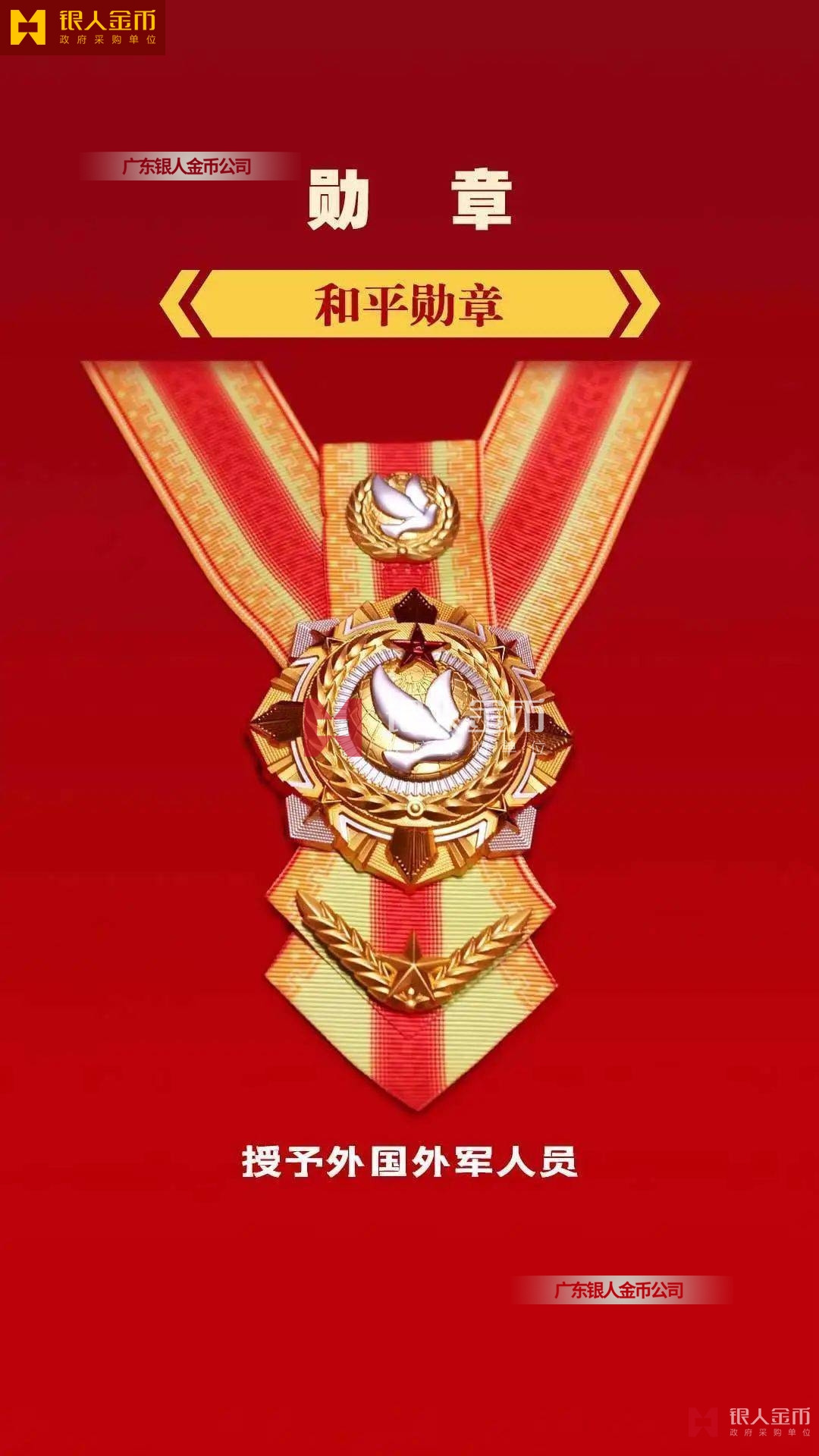 和平獎章,由軍徽、和平鴿、橄欖枝等元素構成,授予外國外軍人員,主章通徑為60mm。