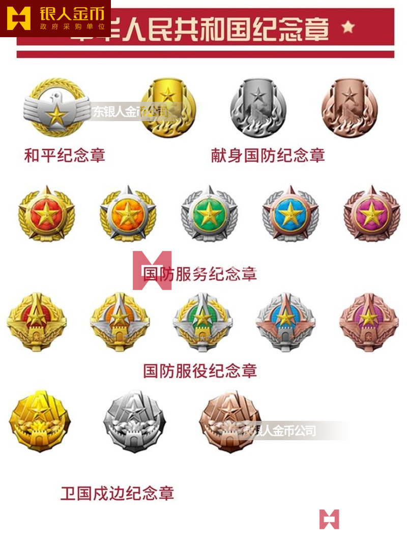 獻(xiàn)身國防紀(jì)念章(按突出貢獻(xiàn)和職務(wù)、服役年限分為:金質(zhì)、銀質(zhì)、銅質(zhì))