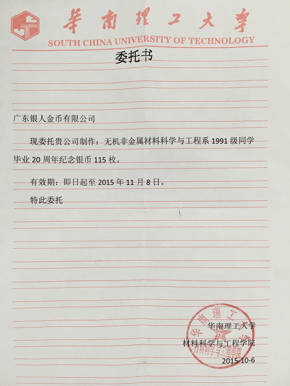 華南理工大學(xué)定制銀幣授權(quán)委托書