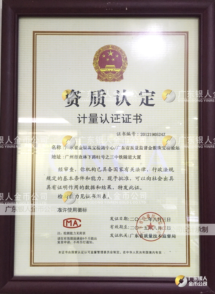 廣東銀人金幣公司承接客戶個(gè)性化定制的金銀幣、金銀章、金銀條、金銀牌、金銀盤均由國(guó)家質(zhì)監(jiān)部門、嚴(yán)格檢測(cè)、權(quán)威鑒定: