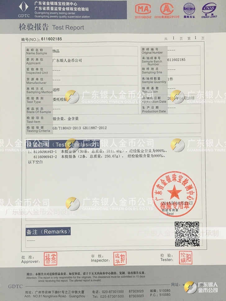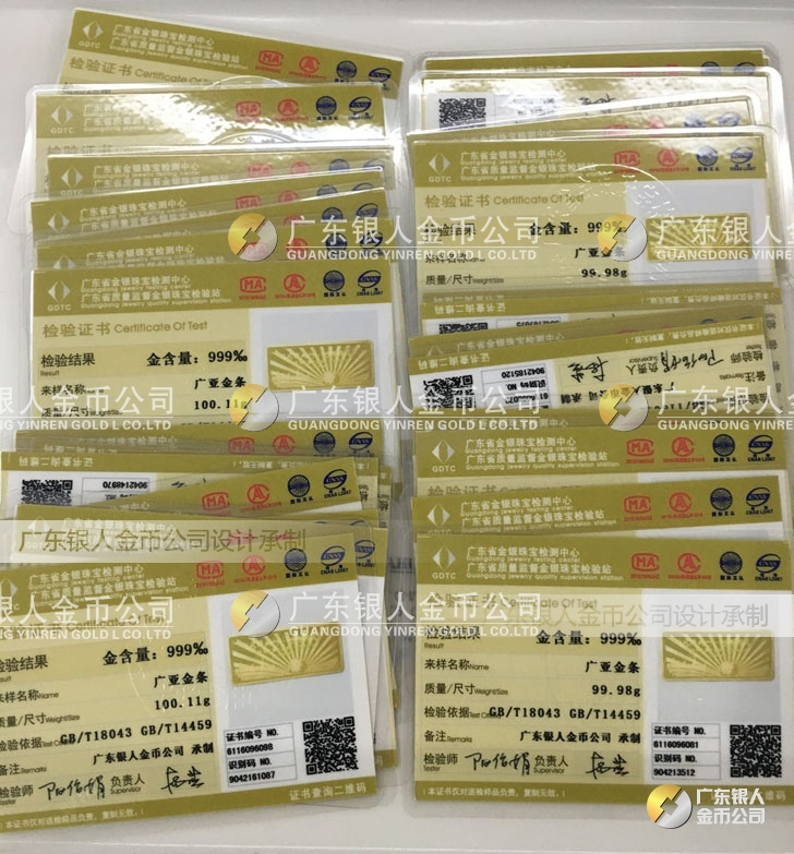 廣東銀人金幣公司承接客戶個(gè)性化定制的金銀幣、金銀章、金銀條、金銀牌、金銀盤均由國(guó)家質(zhì)監(jiān)部門、嚴(yán)格檢測(cè)、權(quán)威鑒定: