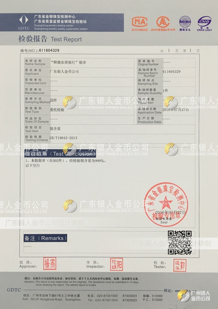 廣東銀人金幣公司承接客戶個性化定制的金銀幣、金銀章、金銀條、金銀牌、金銀盤均由國家質(zhì)監(jiān)部門、嚴(yán)格檢測、權(quán)威鑒定:
